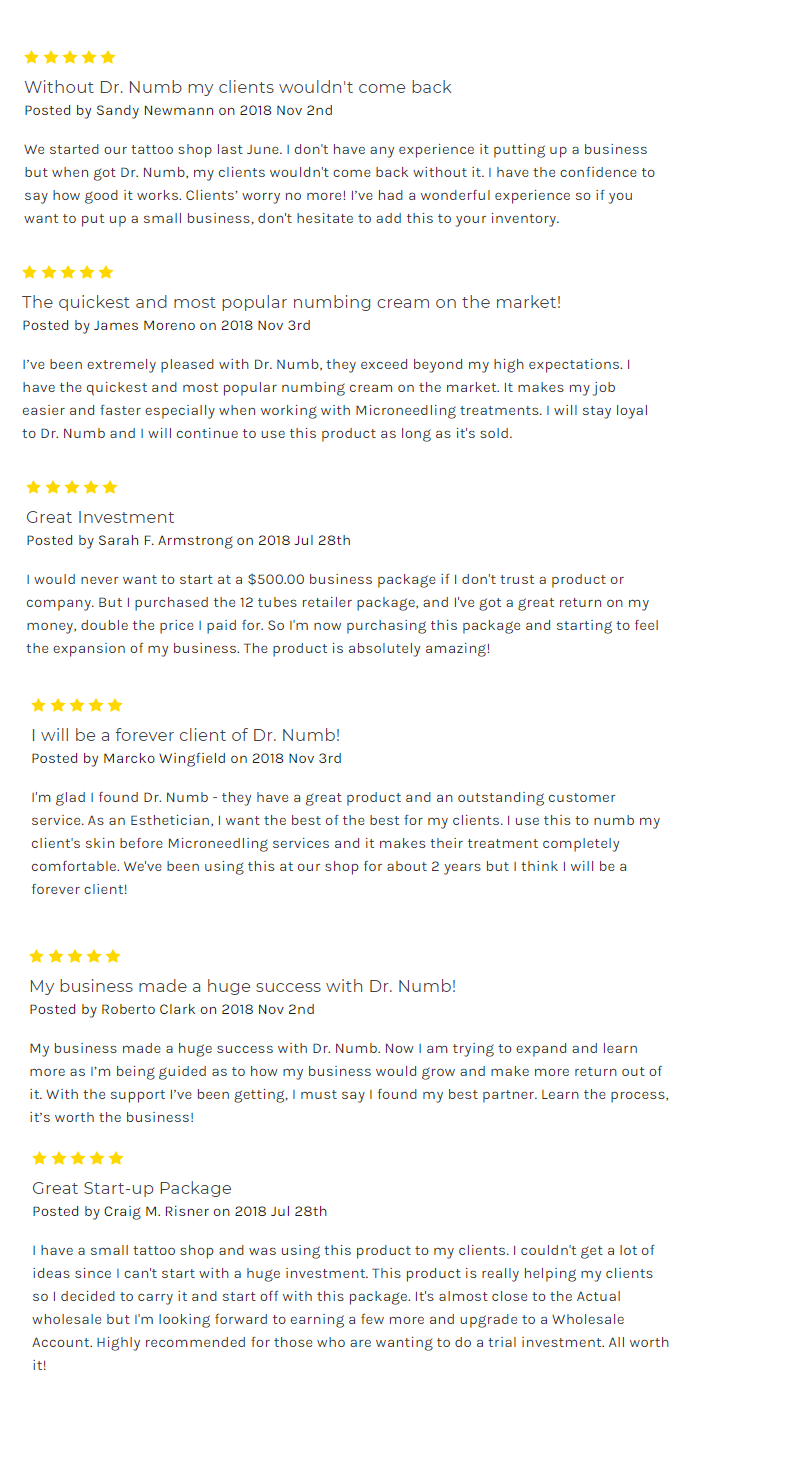 "We own a permanent makeup studio and another artist that a friend of mine recommended that we should try Dr. Numb on our clients to eliminate the pain. Compared to other creams, we find that the 5% pure lidocaine in Dr. Numb is the ultimate numbing cream. It penetrates deep into the skin and lasts longer for 2-3 hours. It's approved by Health Canada and FDA, safe for clients! This is an awesome product!"